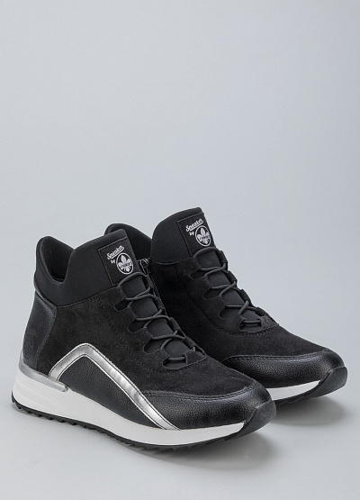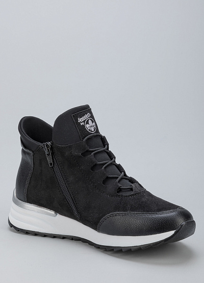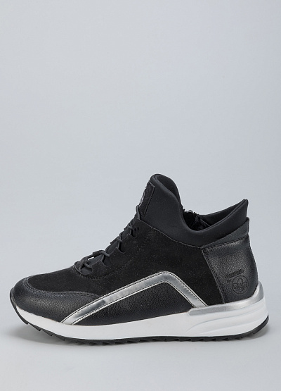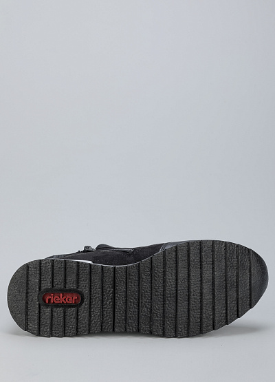 • Женские ботинки из экокожи и текстиля от бренда Rieker. Закругленный носок. Открытая шнуровка в тон. Боковая молния. Язычок и боковая часть украшены логотипом. Плоская рифленая подошва.
