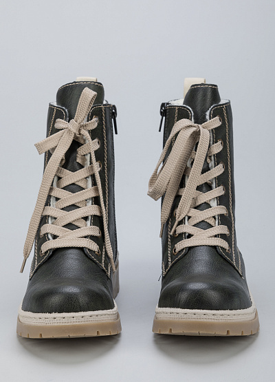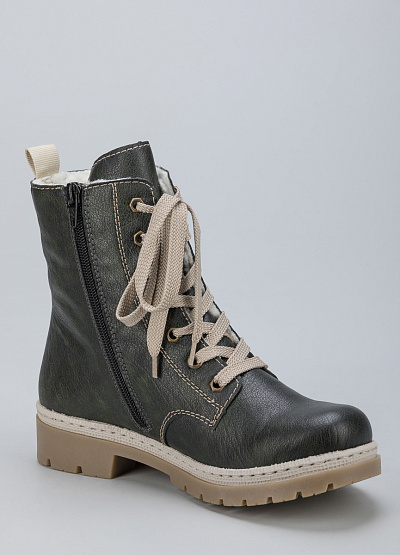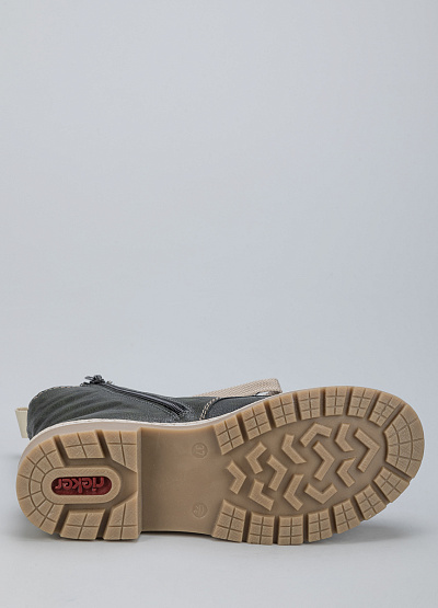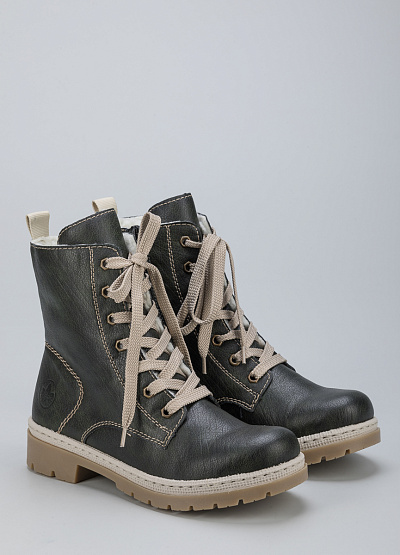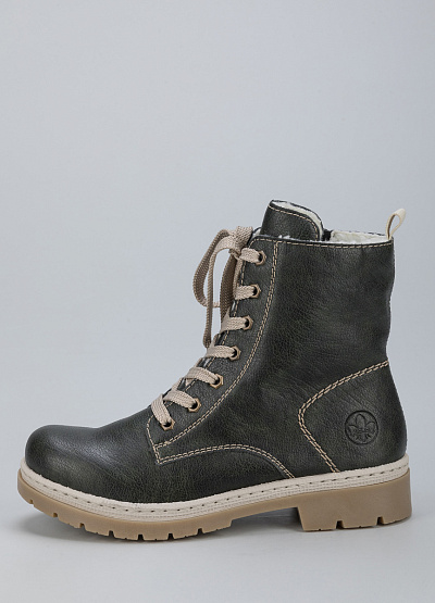 • Женские ботинки из экокожи от бренда Rieker. Закругленный носок. Открытая шнуровка. Боковая молния. Тисненый логотип сбоку. Петли для подтягивания сзади. Плоская рифленая подошва на низком каблуке.