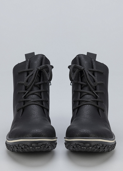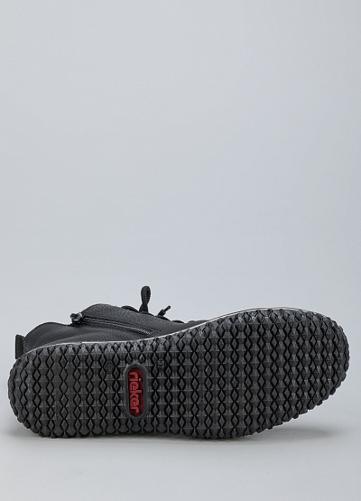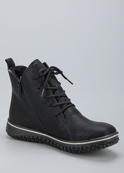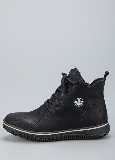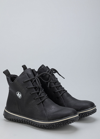 • Женские ботинки из экокожи от бренда Rieker. Закругленный носок. Открытая шнуровка в тон. Боковая молния. Логотип сбоку. Петли для подтягивания сзади. Плоская рифленая подошва.