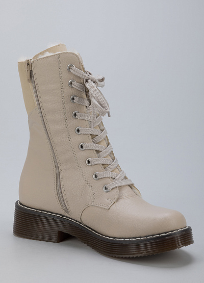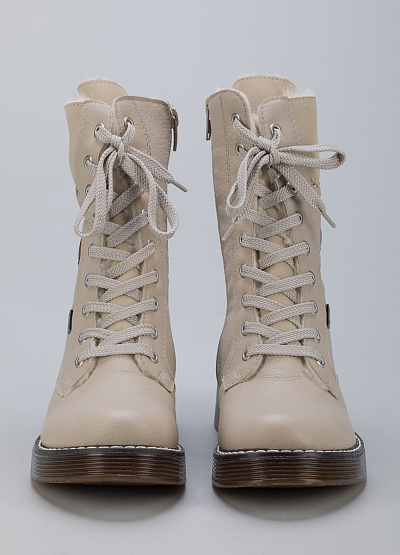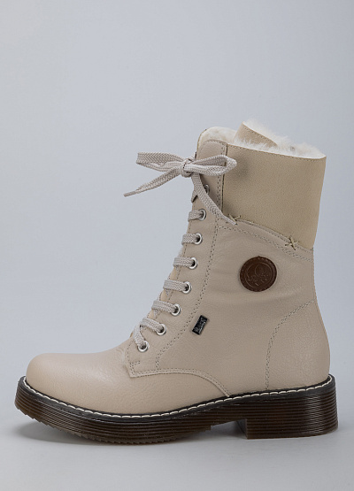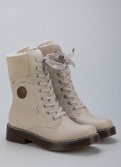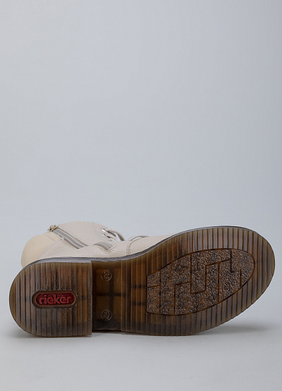 • Женские ботинки из экокожи и текстиля от бренда Rieker. Закругленный носок. Открытая шнуровка в тон. Боковая молния. Логотип сбоку. Плоская рифленая подошва.