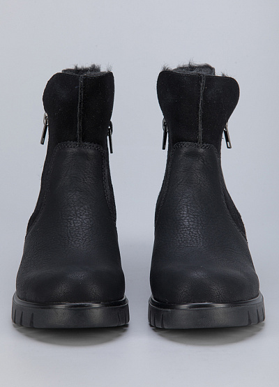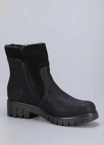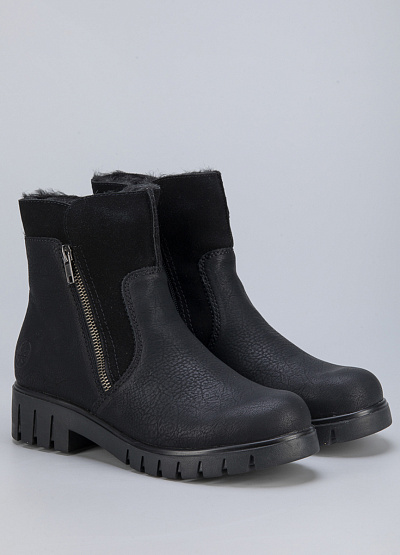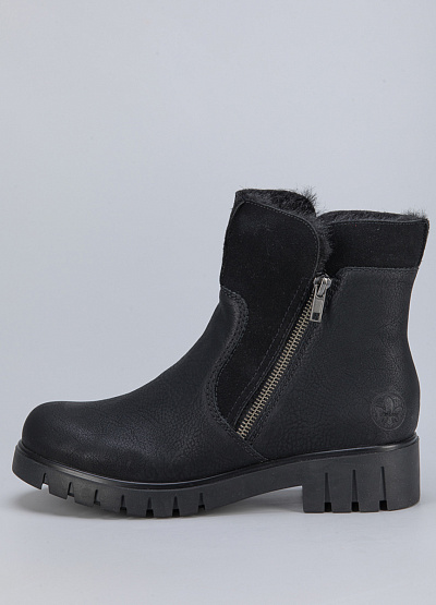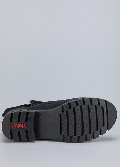 • Женские ботинки от бренда Rieker. Закругленный носок. Боковая молния с двух сторон. Тисненый логотип сбоку. Плоская рифленая подошва на низком каблуке.