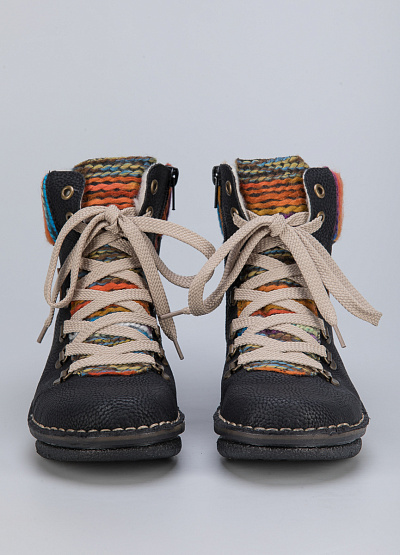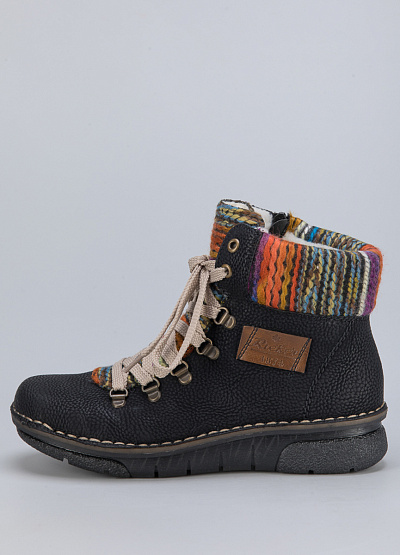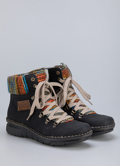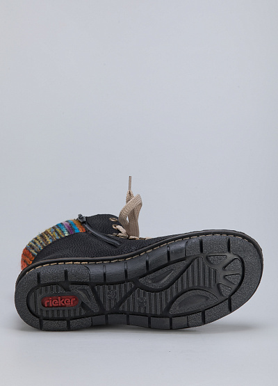 • Женские ботинки из натуральной кожи и текстиля от бренда Rieker. Закругленный носок. Открытая шнуровка в тон. Логотип сбоку. Контрастный язычек и верх в виде цветных нитей. Боковая молния. Рифленая подошва.