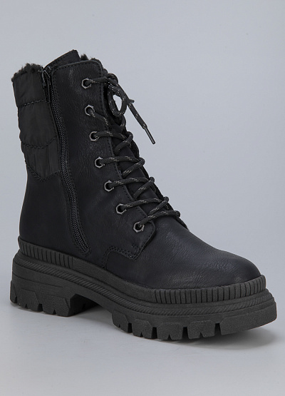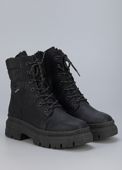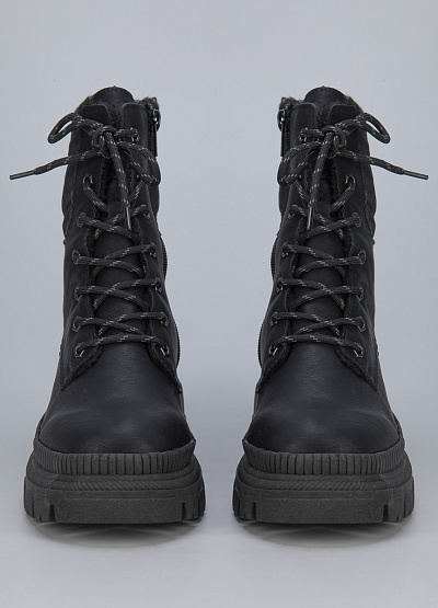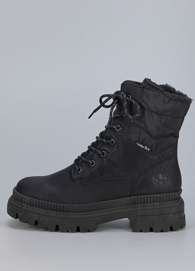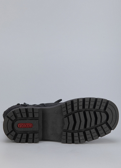 • Женские ботинки из экокожи и текстиля от бренда Rieker. Закругленный носок. Открытая шнуровка в тон. Логотип сбоку. Боковая молния. Массивная рифленая подошва на низком каблуке.