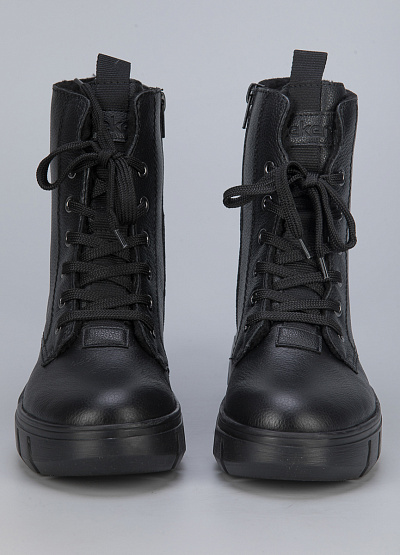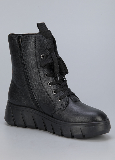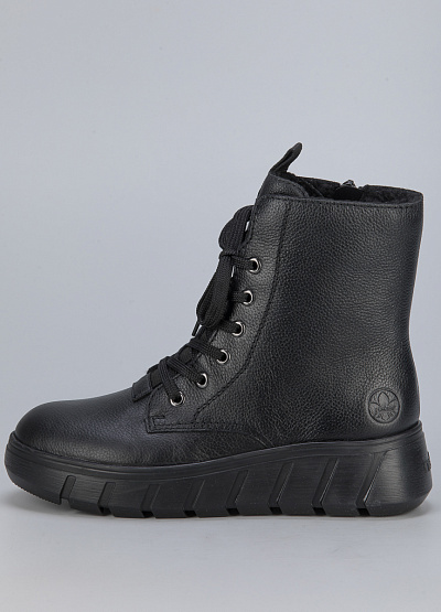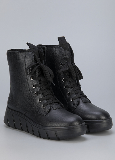 • Женские ботинки из натуральной кожи и экокожи от бренда Rieker. Закругленный носок. Открытая шнуровка в тон. Тисненый логотип сбоку и на язычке. Боковая молния. Широкая рифленая подошва.