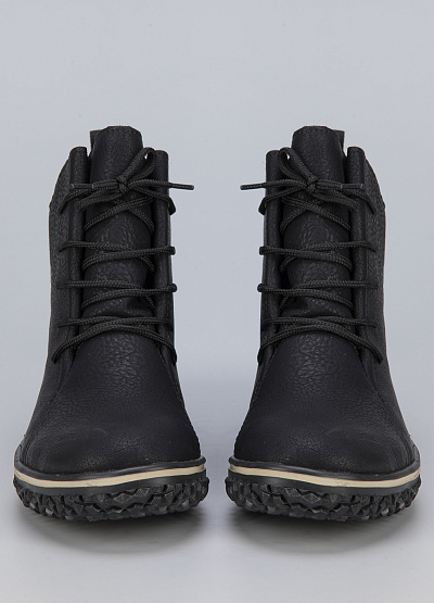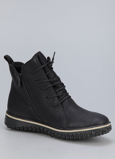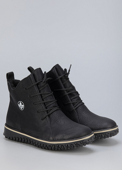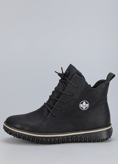 • Женские ботинки из экокожи от бренда Rieker. Закругленный носок. Боковая молния. Логотип сбоку. Петли для подтягивания сзади. Плоская рифленая подошва.