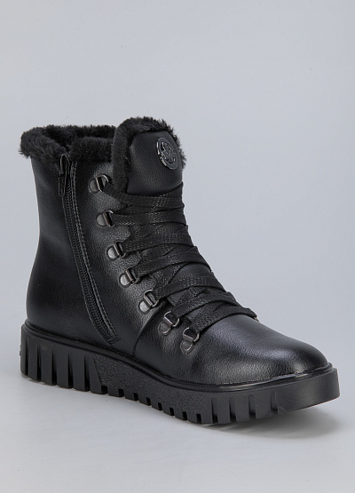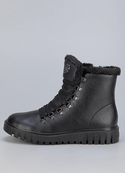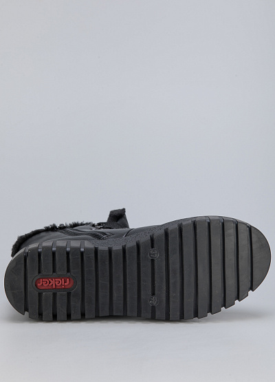 • Женские ботинки от бренда Rieker. Закругленный носок. Боковая молния с двух сторон. Логотип на язычке. Плоская рифленая подошва.