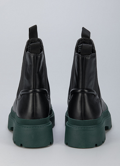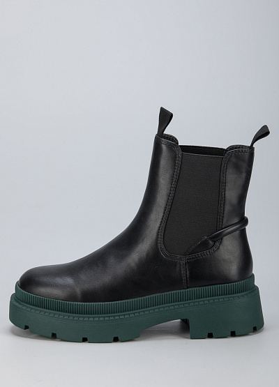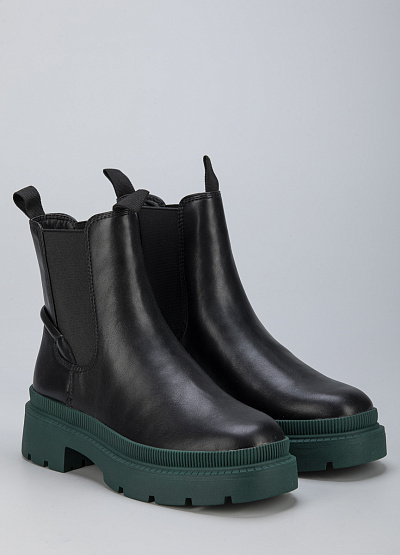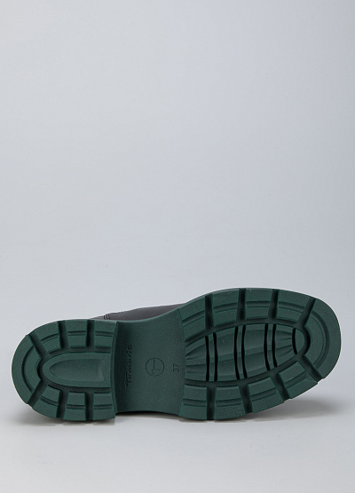 • Женские ботинки из экокожи от бренда Tamaris. Закругленный носок. Эластичные вставки по бокам. Петли для подтягивания сзади и спереди. Массивная рифленая подошва на низком каблуке.