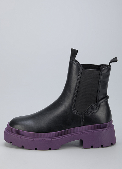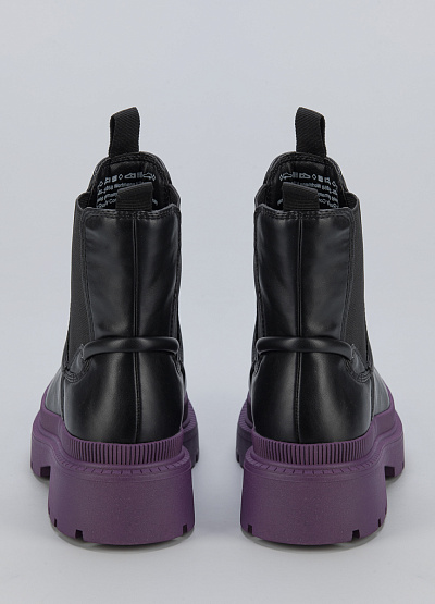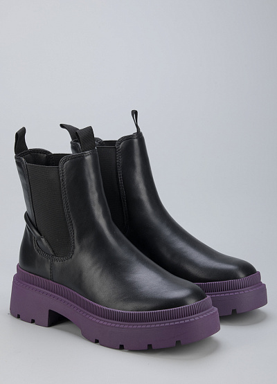 • Женские ботинки из экокожи от бренда Tamaris. Закругленный носок. Эластичные вставки по бокам. Петли для подтягивания спереди и сзади. Декоративный ремешок на пятке. Контрастная массивная рифленая подошва.
