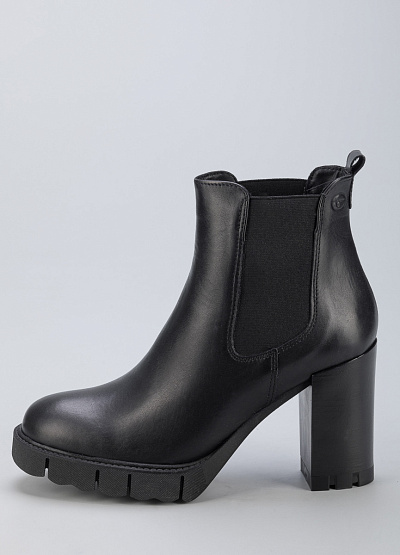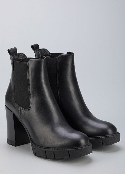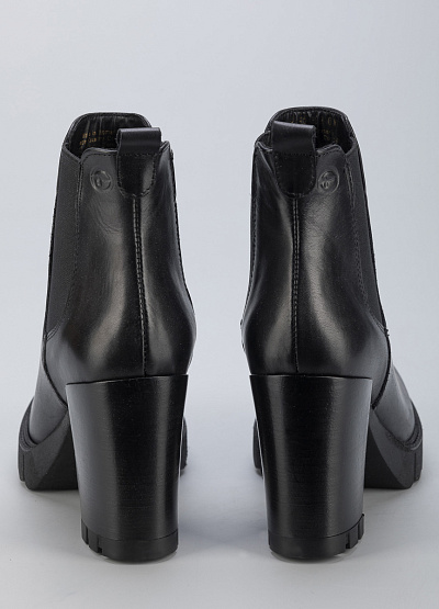 • Женские ботинки из натуральной кожи от бренда Tamaris. Закругленный носок. Эластичные вставки по бокам. Петли для подтягивания спереди и сзади. Массивная рифленая подошва на устойчивом каблуке.