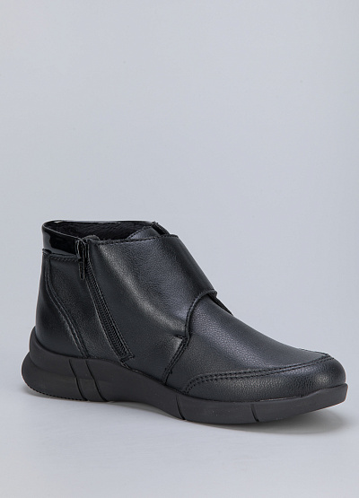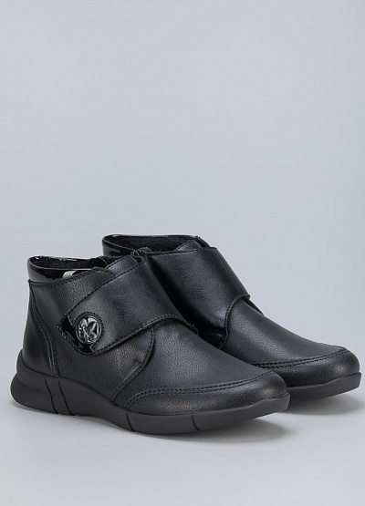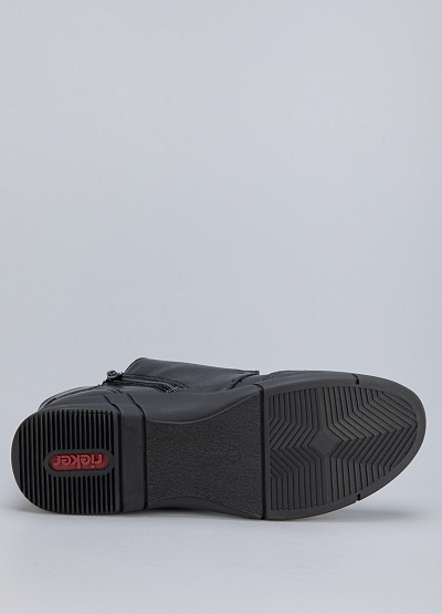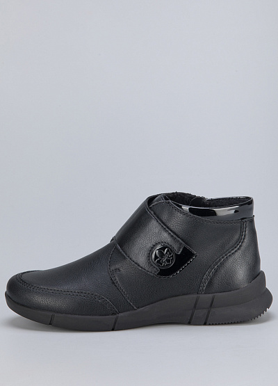 • Женские ботинки из натуральной кожи и экокожи от бренда Rieker. Закругленный носок. Застежка на липучке. Тисненый логотип сбоку. Боковой замок. Рифленая подошва.