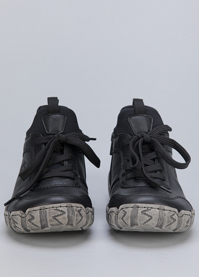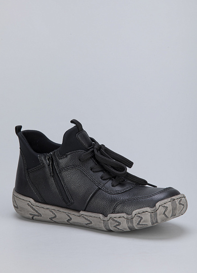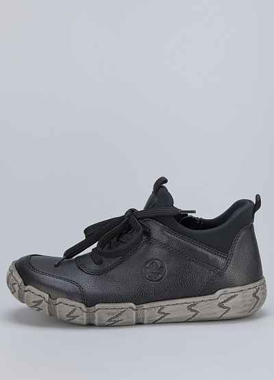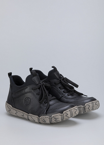 • Женские ботинки из натуральной кожи и экокожи от бренда Rieker. Закругленный носок. Открытая шнуровка в тон. Тисненый логотип сбоку. Боковой замок. Петли для подтягивания сзади. Рифленая подошва.