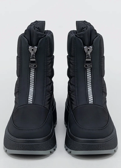 • Женские зимние дутики в универсальном чёрном цвете — практичная модель для холодной погоды, сочетающая комфорт и современный лаконичный дизайн. Верх выполнен из плотного влагостойкого материала с мягкой стёганой структурой, обеспечивающей защиту от холода и ветра. Боковая молния облегчает надевание и снятие обуви, а высокая платформа с рельефной подошвой гарантирует устойчивость и комфорт при ходьбе в зимних условиях. Модель отлично вписывается в повседневный городской гардероб.