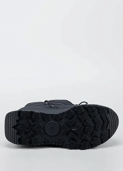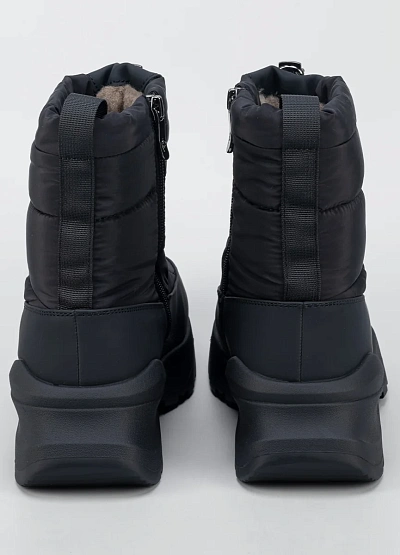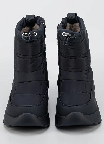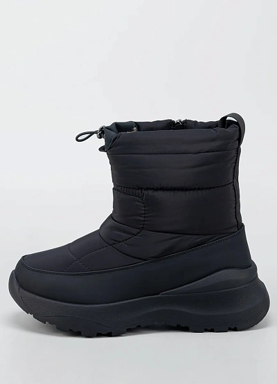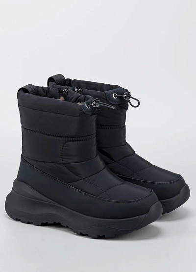 • Женские зимние дутики в минималистичном чёрном исполнении — удобная и практичная модель для холодного сезона. Верх выполнен из плотного влагостойкого текстиля с утеплённой стёганой частью, которая хорошо сохраняет тепло и защищает от ветра. Утягивающий шнур по верхнему краю помогает регулировать посадку и дополнительно препятствует попаданию снега внутрь. Объёмная подошва с мягкой амортизацией и рельефным протектором обеспечивает комфорт при ходьбе и устойчивость на скользких покрытиях.