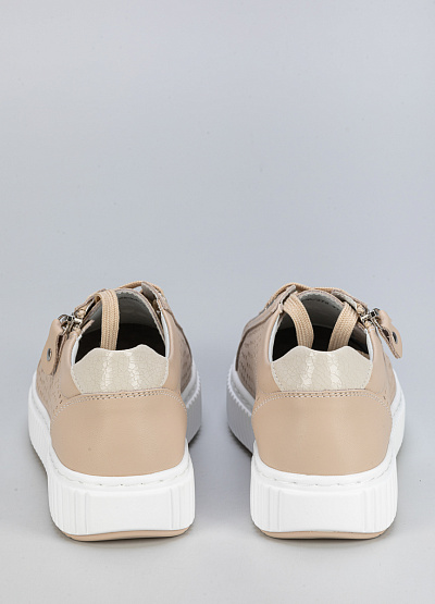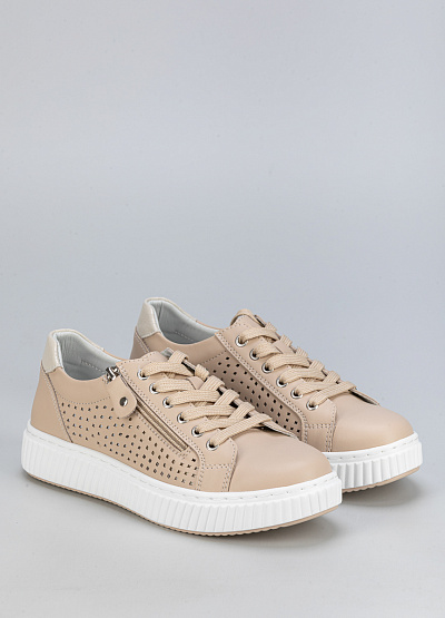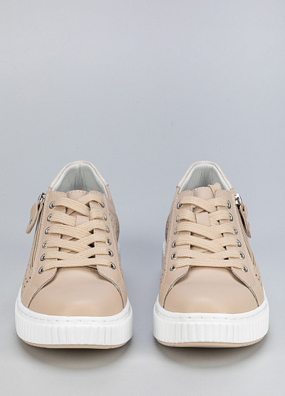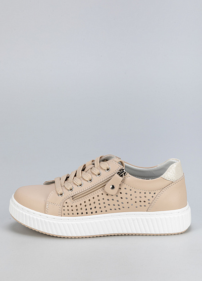 • Женские бежевые кроссовки – стильная и комфортная модель для повседневного гардероба. Выполнены из натуральной кожи с декоративной перфорацией, обеспечивающей легкость и эстетичный вид. Удобная молния позволяет быстро надевать обувь.