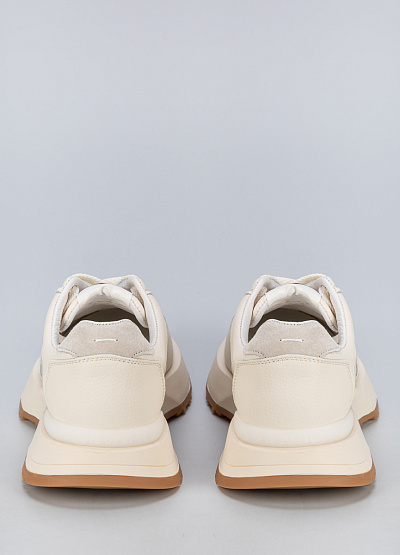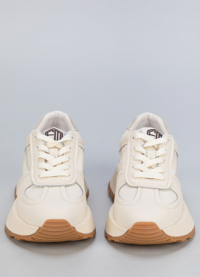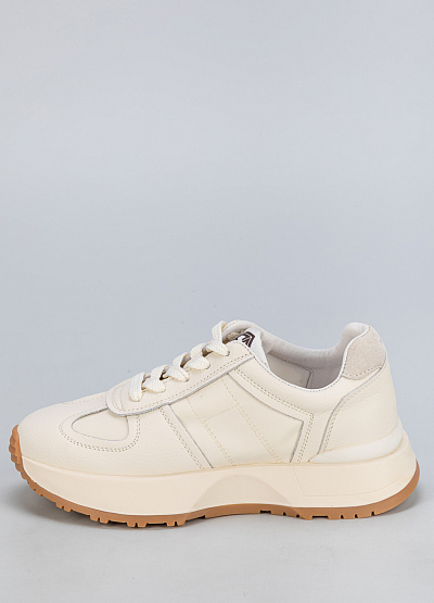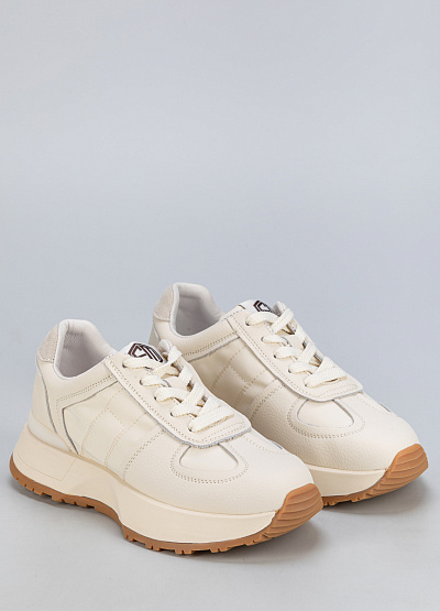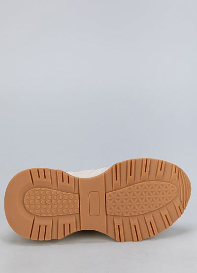 • Это стильные кроссовки молочного цвета с массивной подошвой. Верх выполнен из фактурной экокожи с декоративными строчками, что придаёт обуви элегантный и современный вид. Шнуровка классическая, обеспечивающая комфортную посадку на ноге. Подошва имеет светлый оттенок с коричневым протектором, что делает модель универсальной и практичной. Эти кроссовки подойдут как для повседневного ношения, так и для активного отдыха, сочетая в себе стиль и удобство.