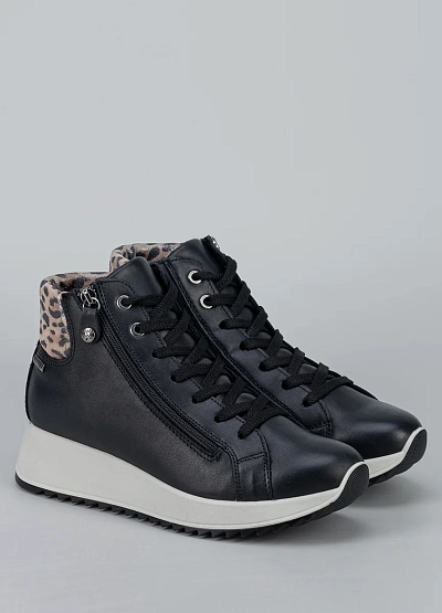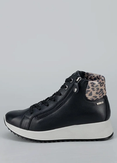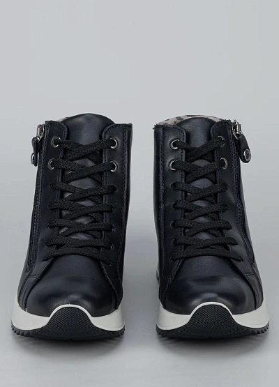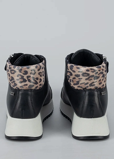 • Стильные женские кроссовки на приподнятой подошве — современная и удобная модель для активного повседневного ношения. Верх выполнен из гладкого кожзама, дополненного мягким манжетом с леопардовым принтом, что придаёт образу модный акцент. Шнуровка в сочетании с функциональной боковой молнией обеспечивает удобство и точную фиксацию стопы. Приподнятая амортизирующая подошва делает шаги мягче и обеспечивает комфорт при длительной ходьбе.