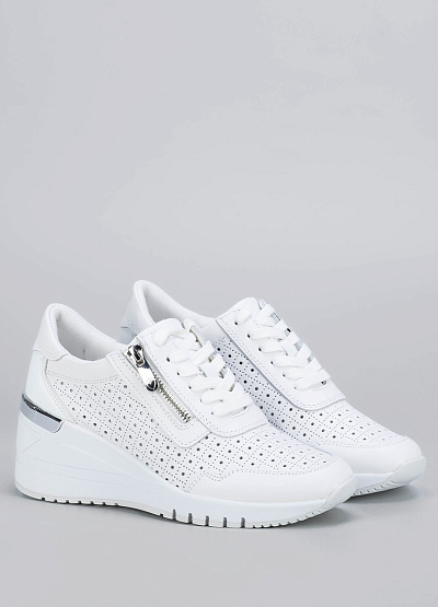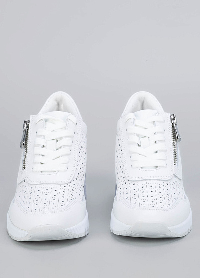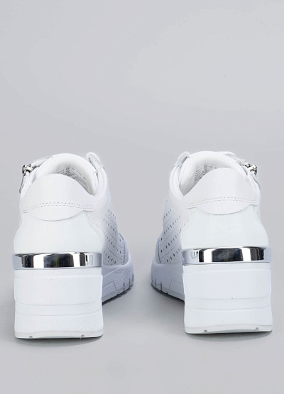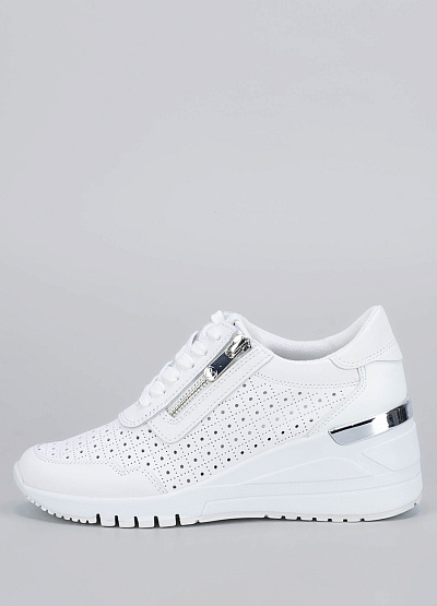 • Современные белые кроссовки — это сочетание спортивного комфорта и стильного дизайна. Модель выполнена из гладкого материала с перфорацией для лучшей вентиляции, а скрытая танкетка придаёт ноге изящный изгиб, визуально удлиняя силуэт. Контрастные металлические акценты и декоративная молния добавляют модного блеска, а мягкая внутренняя отделка обеспечивает комфорт при длительной носке. Отличный вариант для активных городских будней и стильных прогулок.
