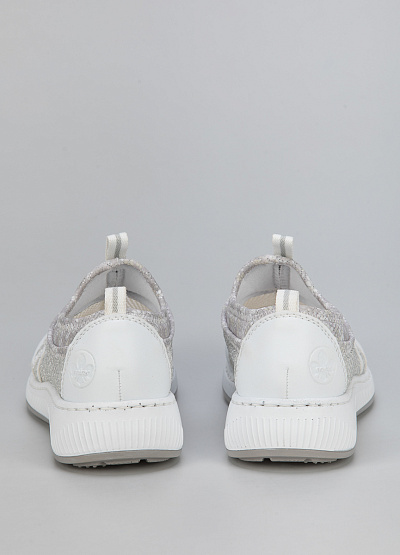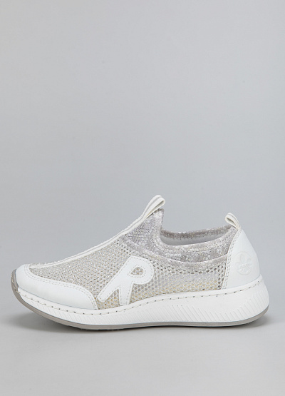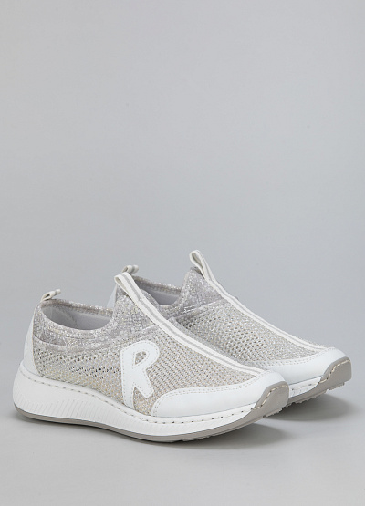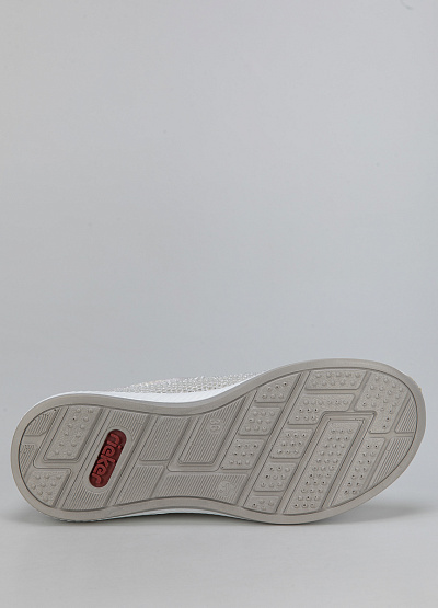 • Женские кроссовки из экокожи и текстиля от бренда Rieker. Закругленный носок. Петли для подтягивания сзади и на язычке. Логотип сбоку. Широкая рифленая подошва.