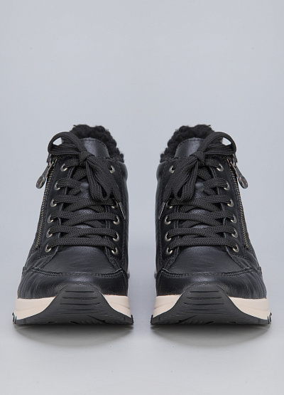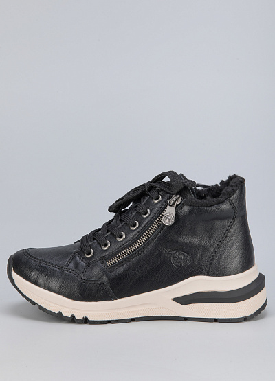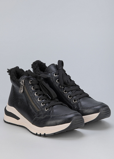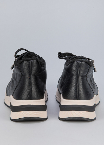 • Женские кроссовки из экокожи от бренда Rieker. Закругленный носок. Открытая шнуровка в тон. Боковая молния. Логотип сбоку. Широкая рифленая подошва.