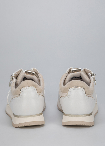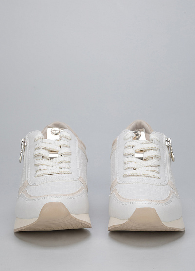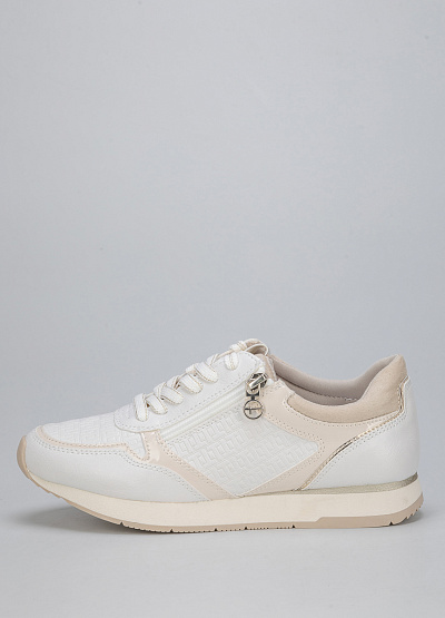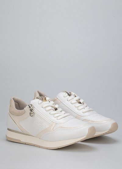 • Женские кроссовки из экокожи и текстиля от бренда Tamaris. Закругленный носок. Открытая шнуровка в тон. Петли для подтягивания на язычке. Боковая молния. Плоская рифленая подошва.