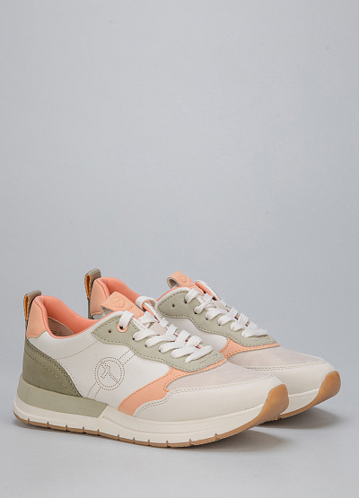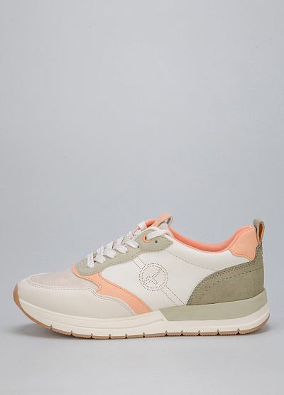 • Женские кроссовки из экокожи и текстиля от бренда Tamaris. Закругленный носок. Открытая шнуровка в тон. Петли для подтягивания сзади и на язычке. Плоская рифленая подошва.