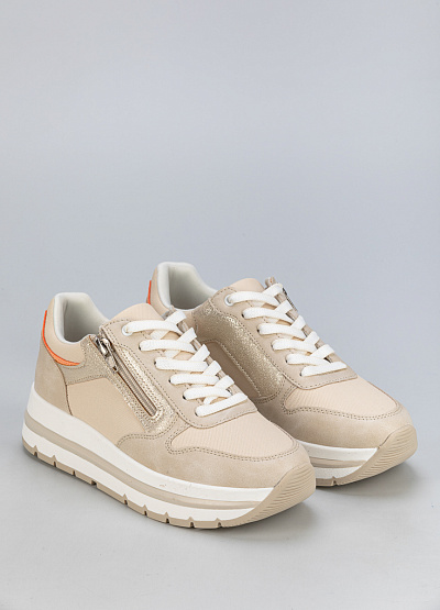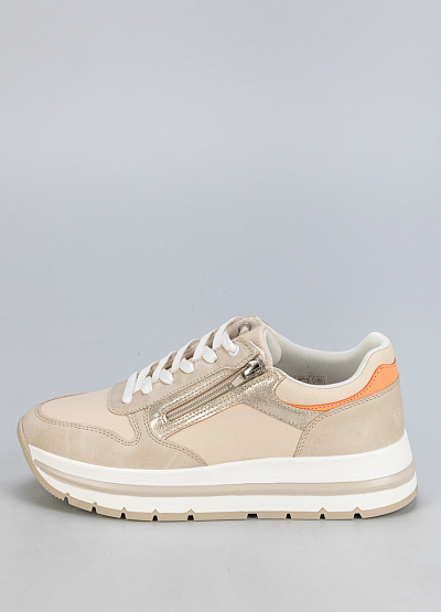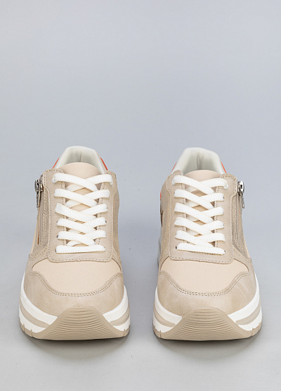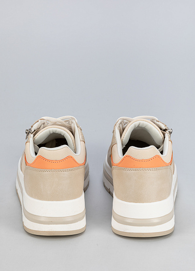 • Эти стильные женские кроссовки идеально подходят для повседневного ношения. Модель выполнена в бежевом цвете с изысканными золотистыми и персиковыми вставками, что придает ей элегантный и современный вид. Удобная колодка и качественные материалы обеспечивают комфорт в течение всего дня.