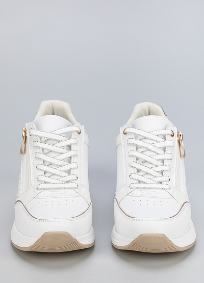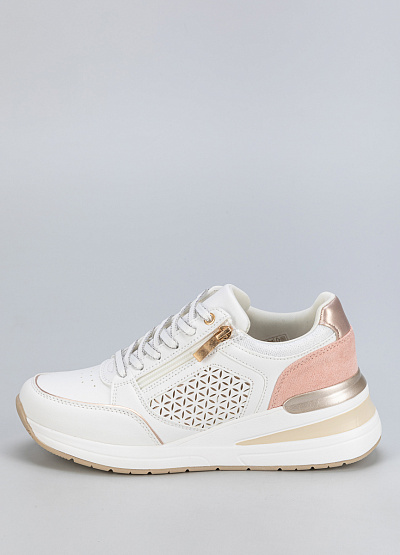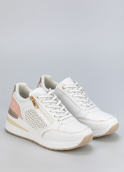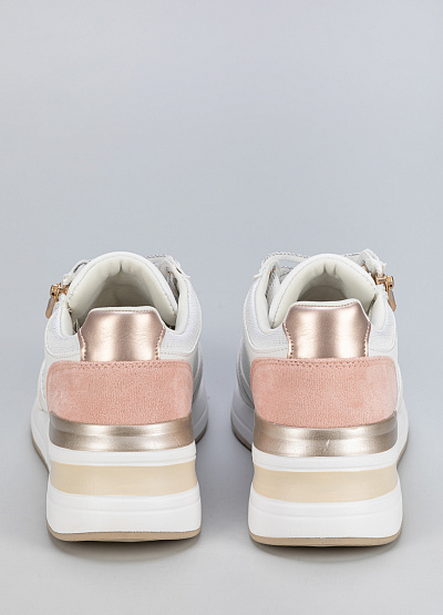 • Женские кроссовки в бело-розовом цвете с золотистыми деталями создают элегантный и утончённый образ. Выполнены в современном городском стиле, идеально подчеркивая вкус и индивидуальность. Модель сочетает в себе комфорт и актуальный дизайн с декоративной молнией и замшевыми вставками.