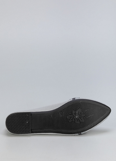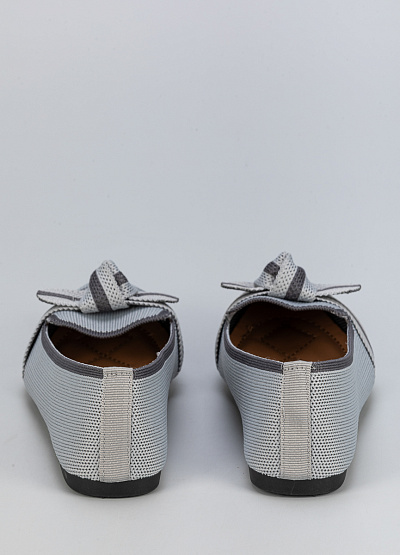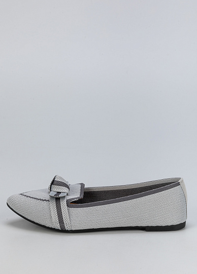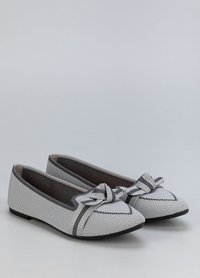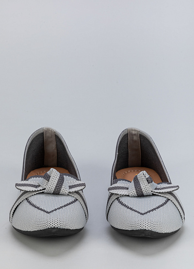 • Женские балетки из текстиля в сером цвете с декоративным бантом.