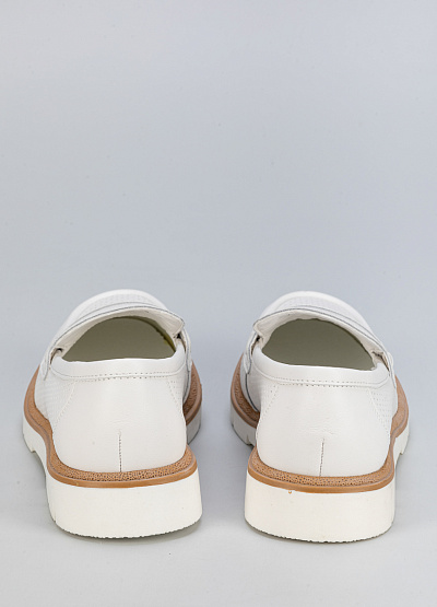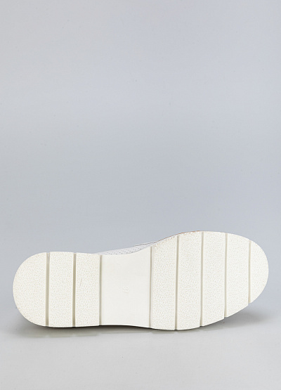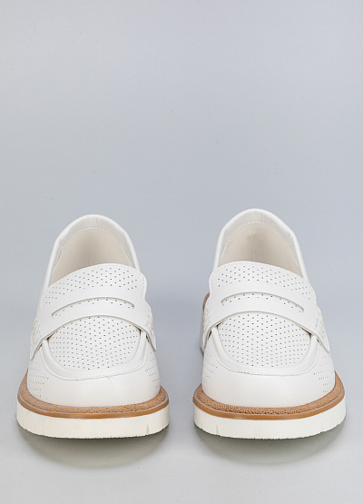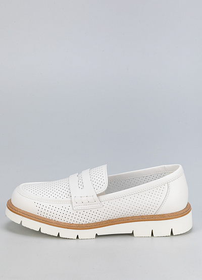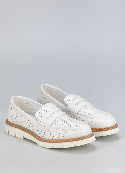 • Женские белые перфорированные лоферы из кожи – стильное и комфортное решение для повседневной носки. Перфорация по всей поверхности обеспечивает отличную вентиляцию, а объемная подошва с протектором добавляет устойчивости и амортизации. Универсальный дизайн делает модель идеальной для создания легких летних образов.