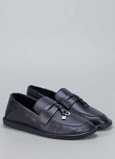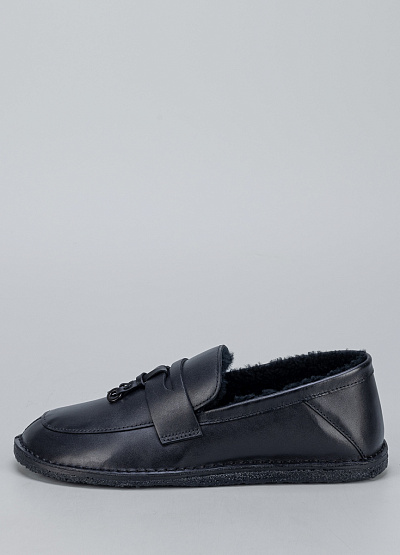 • Удобные мужские домашние лоферы в черном цвете — практичная и тёплая модель для холодного сезона. Верх выполнен из гладкого материала, напоминающего кожу, а внутренняя меховая отделка обеспечивает мягкость и отличное утепление. Декоративная перемычка и аккуратная фурнитура добавляют модели стильный акцент, сохраняя её универсальность. Легкая и гибкая подошва делает обувь комфортной для ежедневного использования дома или на даче.