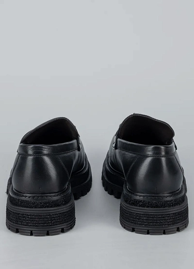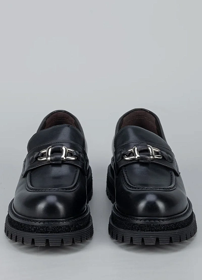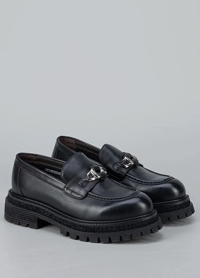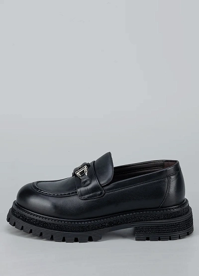 • Женские лоферы в современном городском стиле сочетают в себе классику и актуальные тренды. Модель выполнена из гладкой кожи с аккуратным закруглённым носком и декоративной металлической фурнитурой на союзке, что придаёт обуви выразительный и стильный акцент. Массивная подошва с рельефным протектором обеспечивает устойчивость и комфорт при ходьбе, делая эту пару отличным выбором для активных будней и модных повседневных образов.