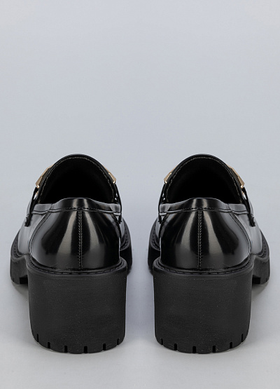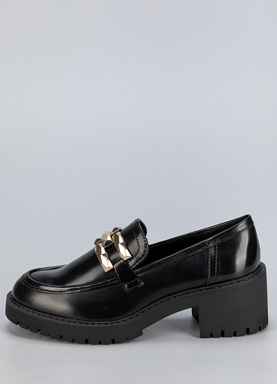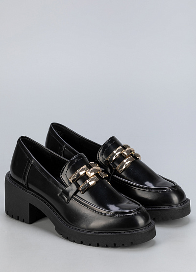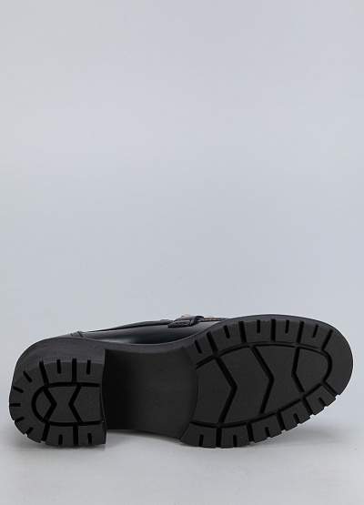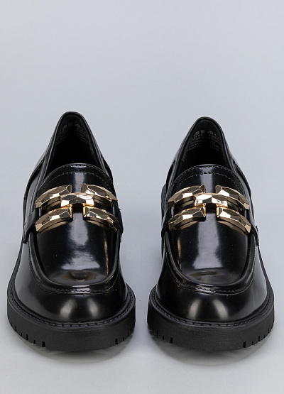 • Это стильные женские лоферы черного цвета с массивной подошвой. Верх обуви выполнен из гладкой экокожи, что придает ей элегантный и современный вид. Декоративный элемент в виде золотистых металлических вставок на верхней части добавляет изысканности и делает обувь более выразительной. Толстая рифленая подошва обеспечивает комфорт при ходьбе и придает обуви модный акцент. Эти лоферы отлично подойдут как для повседневного, так и для делового образа.