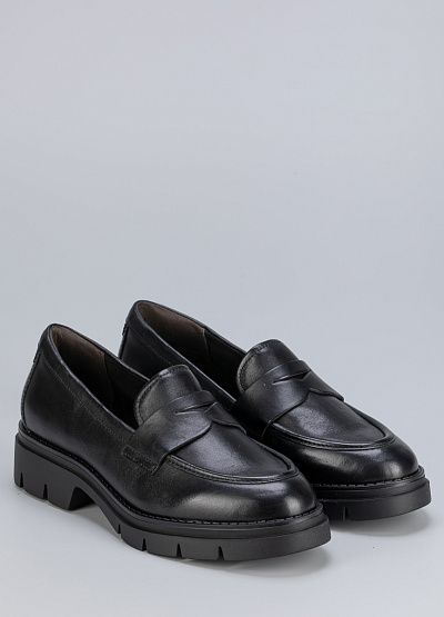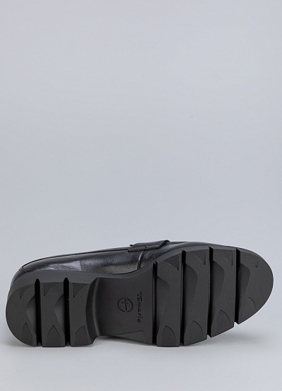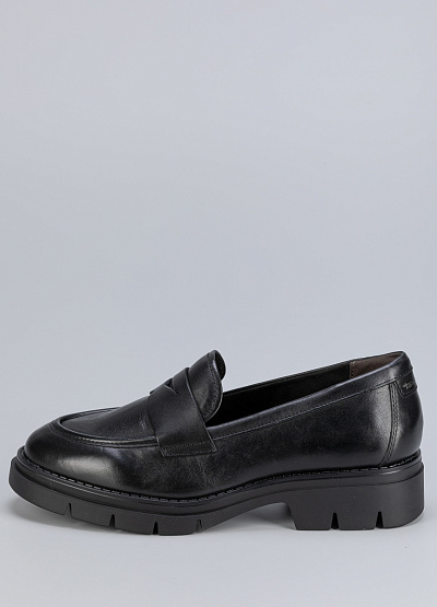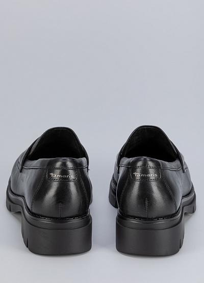 • Женские лоферы черного цвета из натуральной кожи от бренда Tamaris. Они подойдут для повседневной носки — в них будет комфортно даже во время активного движения.