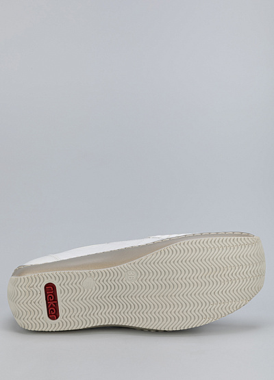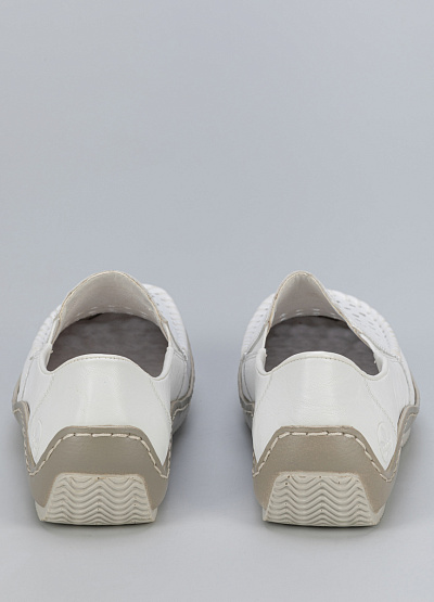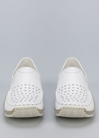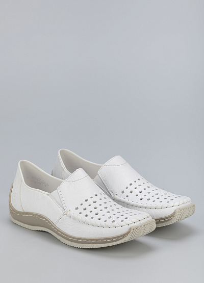 • Женские мокасины белого цвета из натуральной кожи и экокожи от бренда Rieker. Они подойдут для повседневной носки — в них будет комфортно даже во время активного движения. Сквозная перфорация позволит стопе дышать целый день и отводить лишнюю влагу.