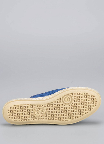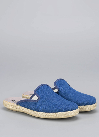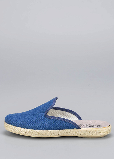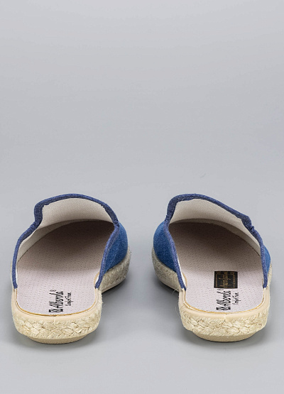 • Лёгкие женские тапочки в стиле эспадрилий выполнены из прочного денима насыщенного синего цвета. Открытая пятка и удобная посадка делают эту модель отличным выбором для дома, дачи или повседневной прогулки. Джутовая оплетка подошвы добавляет образу нотку средиземноморского стиля.