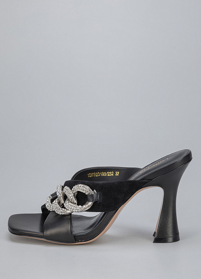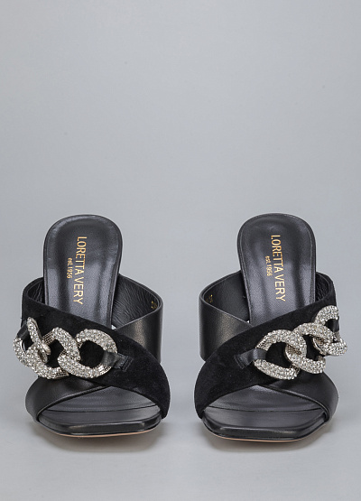 • Женские мюли из натуральной кожи и замши от бренда Loretta Very. Модель с квадратным мысом и с широкими перекрещивающимися ремешками, дополнены декором в виде крупной цепи. Серебристая фурнитура. Устойчивый каблук средней высоты.