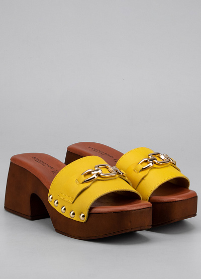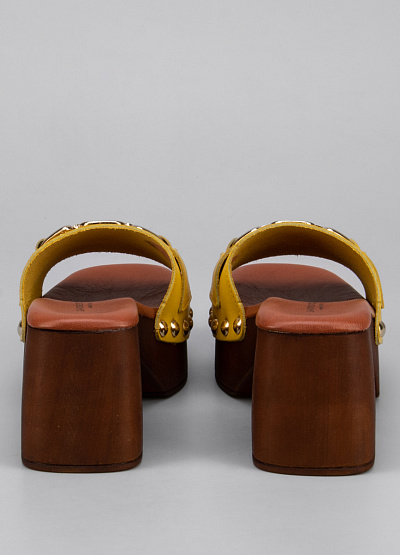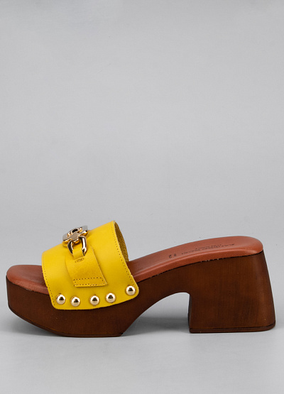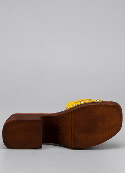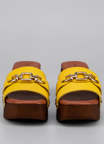 • Женские сабо из замши от бренда Sandro Rossi. Закругленный носок. Декор в виде золотистой цепи.Кнопки вдоль подошвы. Широкая подошва на высоком каблуке.