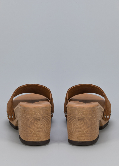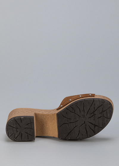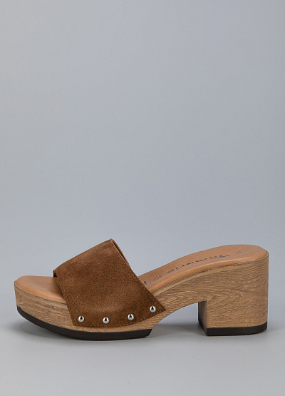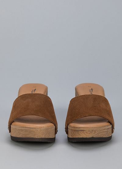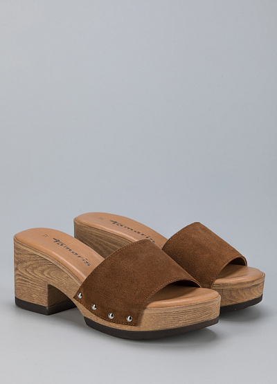 • Сабо из замши от бренда Tamaris. Модель с открытым носком. Устойчивый каблук средней высоты. Серебристая фурнитура.
