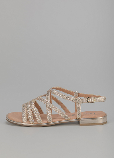 • Женские сандалии из натуральной кожи от бренда Caprice. Модель с множественными перекрещивающимися перемычками. Застежка-ремешок на заднике. Плоская подошва на низком каблуке.
