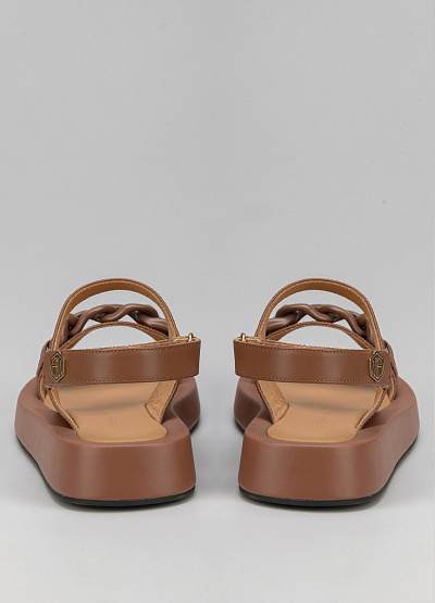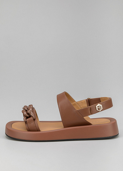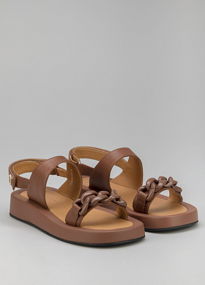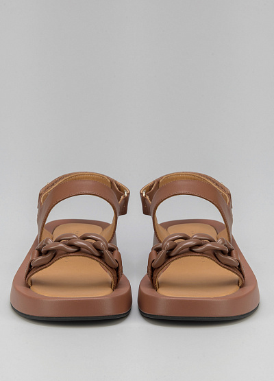 • Женские сандалии коричневого цвета из натуральной кожи от бренда Franco Manatti. Модель с двумя широкими перемычками. Декор в виде цепи. Застежка-ремешок. Плоская подошва.