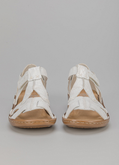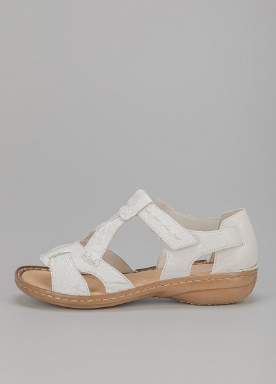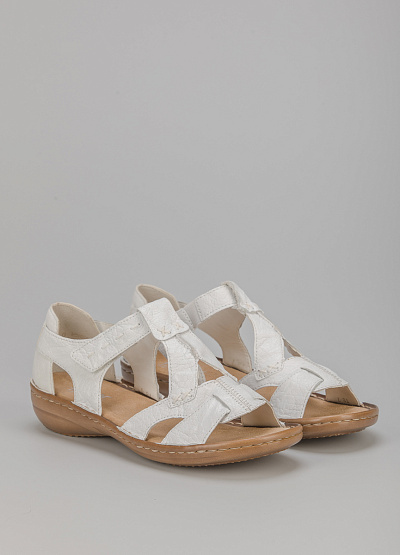 • Женские сандалии от бренда Rieker. Модель с перекрещивающимися перемычками. Закрытый задник. Застежка-липучка. Плоская рифленая подошва на низком каблуке.