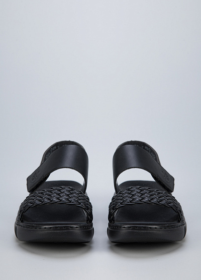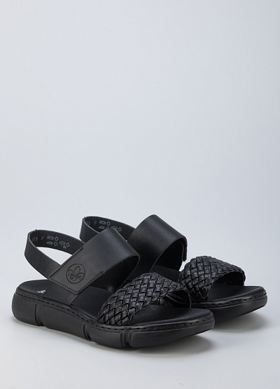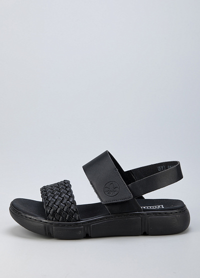 • Женские сандалии из экокожи от бренда Rieker. Модель с открытым носком. Плетеный ремешок. Застежка-липучка на подъеме. Массивная рифленая подошва.