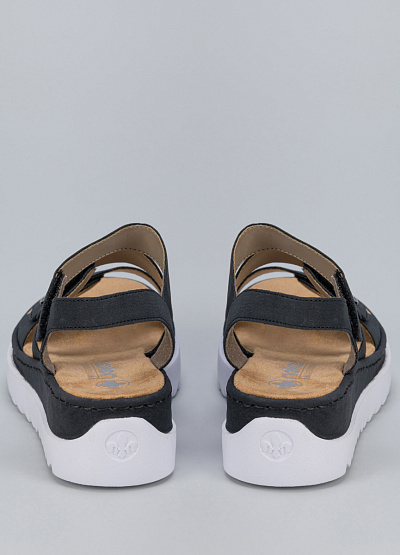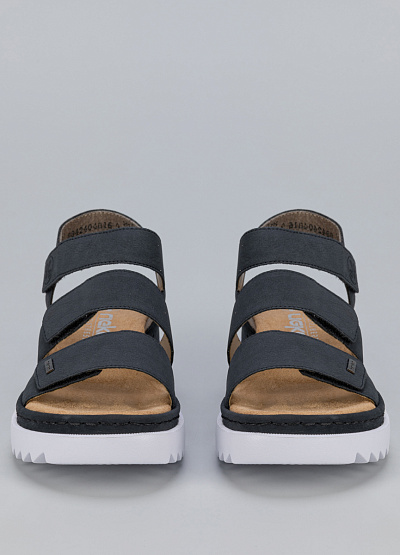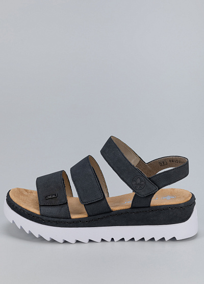 • Женские сандалии из экокожи от бренда Rieker. Модель подойдет для долгой летней прогулки и для повседневной носки. Рифленая подошва на подъеме с широкими объемными ремешками и застежку на липучку прекрасно сочетаются не только с джинсами, брюками, шортами, но и с легкими и воздушными платьями миди и макси, создавая эффектный стильный контраст.