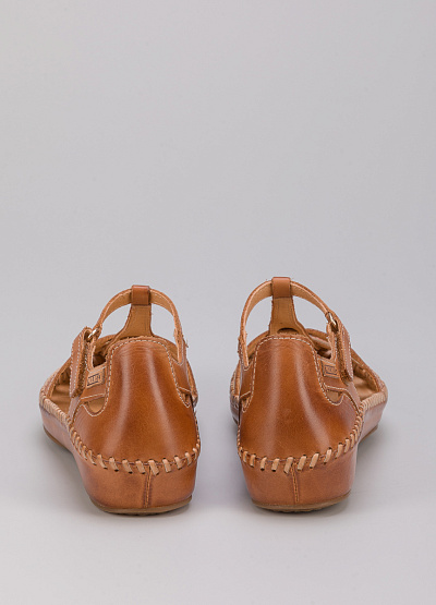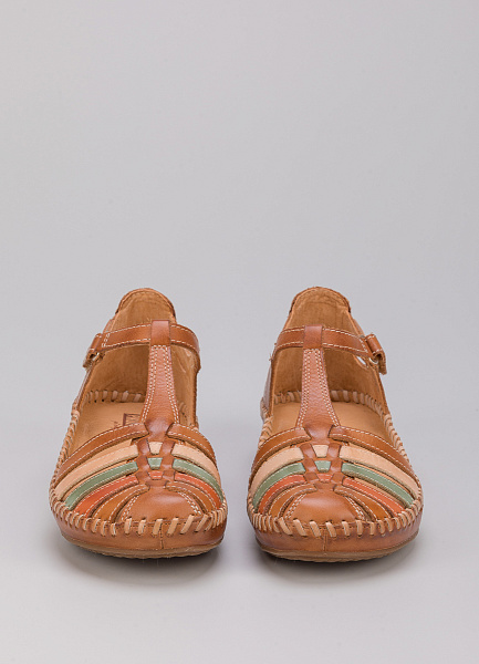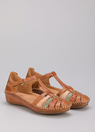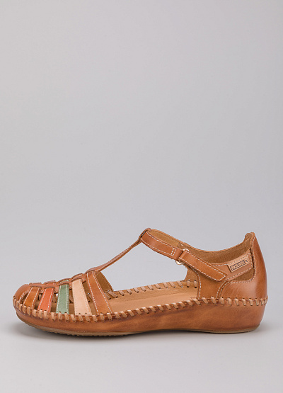 • Женские закрытые сандалии из натуральной кожи от бренда Pikolinos. Застежка-липучка на щиколотке. Плоская подошва украшена контрастным швом.