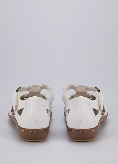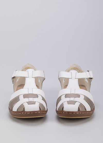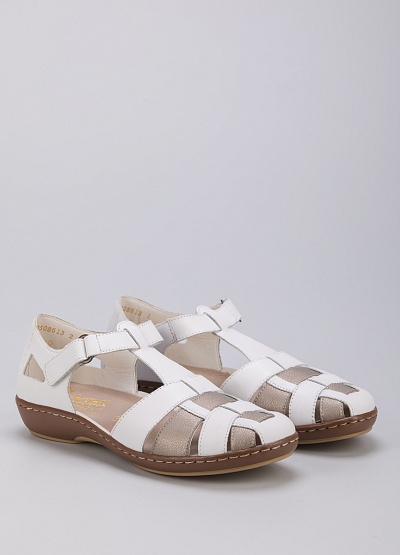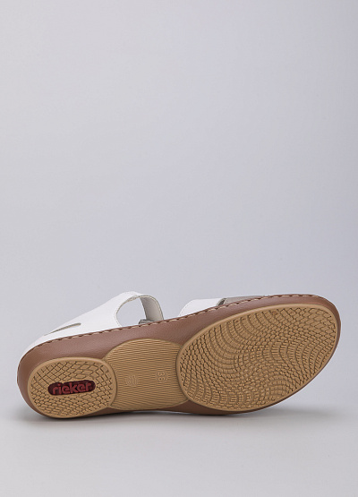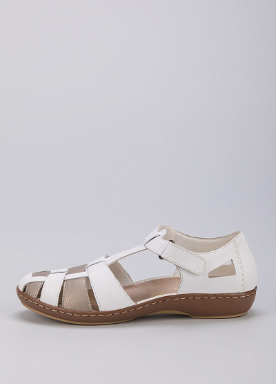 • Женские закрытые сандалии из натуральной кожи и экокожи от бренда Rieker. Застежка-липучка на щиколотке. Плоская подошва украшена контрастным швом.
