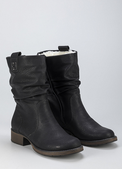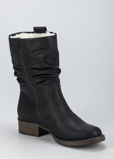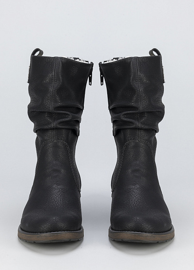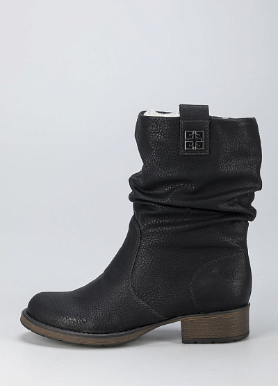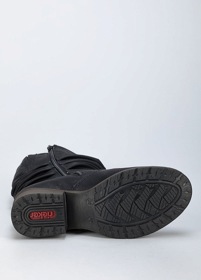 • Женские сапоги из экокожи от бренда Rieker. Закругленный носок. Замок на молнии сбоку. Петли для подтягивания сзади сбоку. Драпировка. Плоская подошва на среднем каблуке.