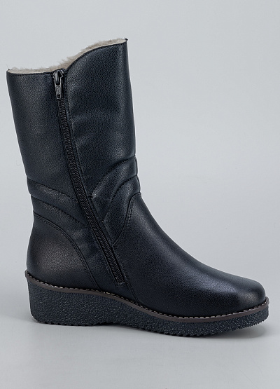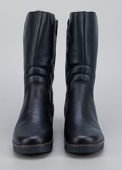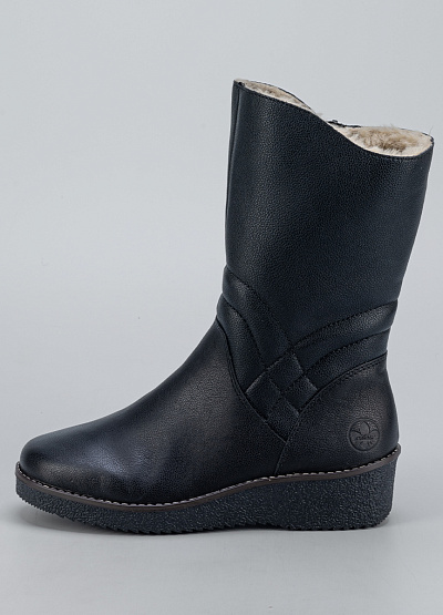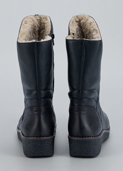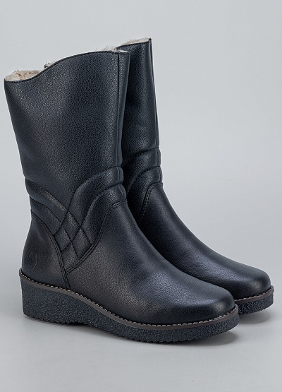 • Женские зимние сапоги Rieker в классическом черном цвете — практичная и теплая модель для холодного сезона. Высокое мягкое голенище с декоративными перекрестными швами создает аккуратный и женственный силуэт, а внутренняя меховая отделка обеспечивает надежное утепление. Легкая танкетка придает комфорт и дополнительную устойчивость, сохраняя обувь удобной для ежедневной носки. Рельефная подошва гарантирует хорошее сцепление с поверхностью зимой.