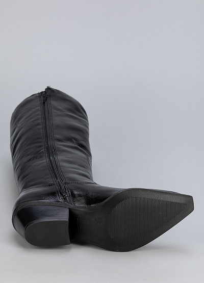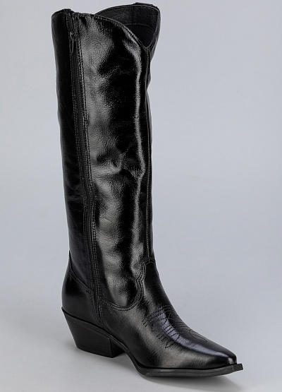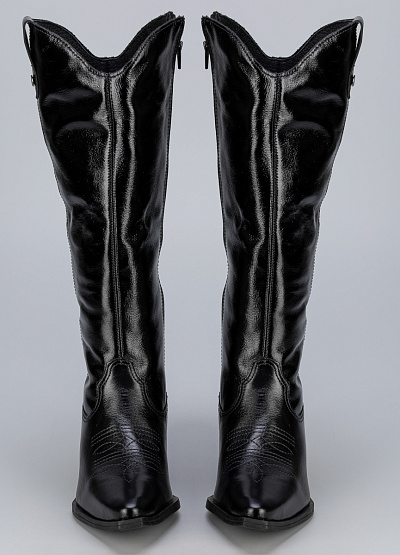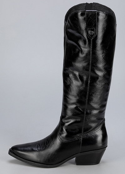 • Женские сапоги в стиле вестерн Bottero — воплощение элегантности и уверенности. Модель выполнена из чёрной лаковой кожи с глянцевым блеском, который придаёт образу дерзкий акцент. Удлинённый силуэт и заострённый носок подчёркивают изящество ног, а устойчивый каблук делает пару удобной для повседневной носки. Эти сапоги станут эффектным элементом любого стильного ансамбля.