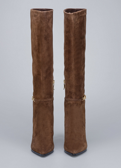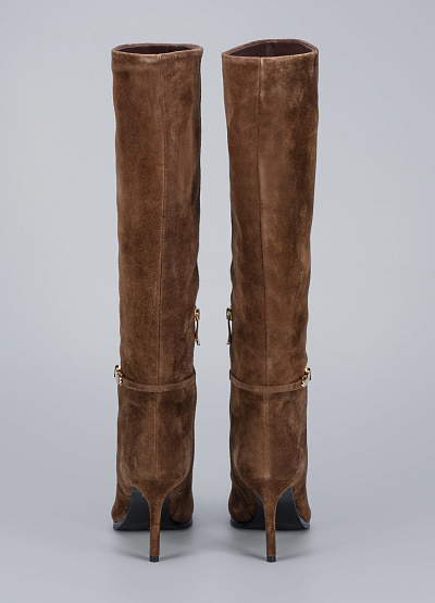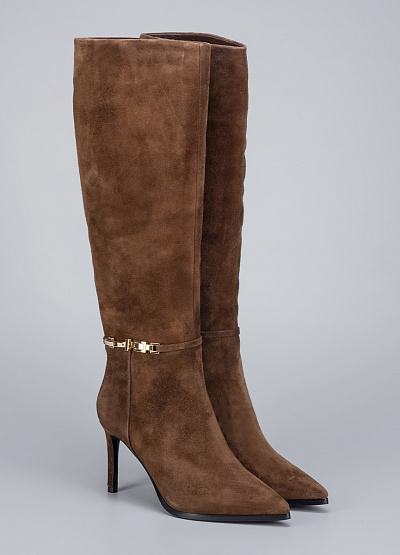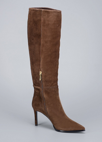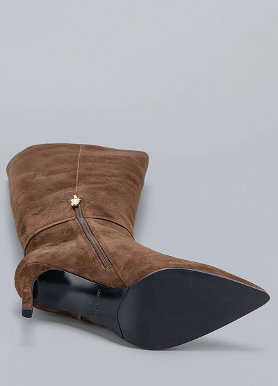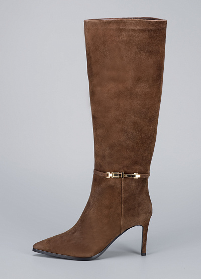 • Женские замшевые сапоги в коричневом цвете от бренда Loretta Very. Элегантная модель на каблуке придает образу женственность и уникальность. Модель с высокой голенью. Заостренный носок.
