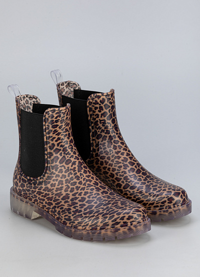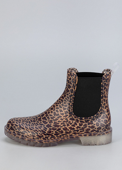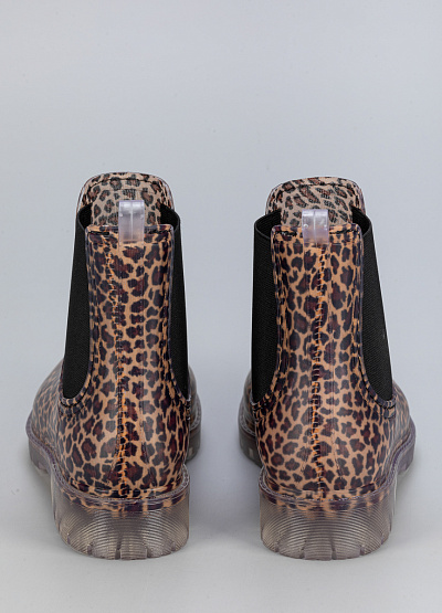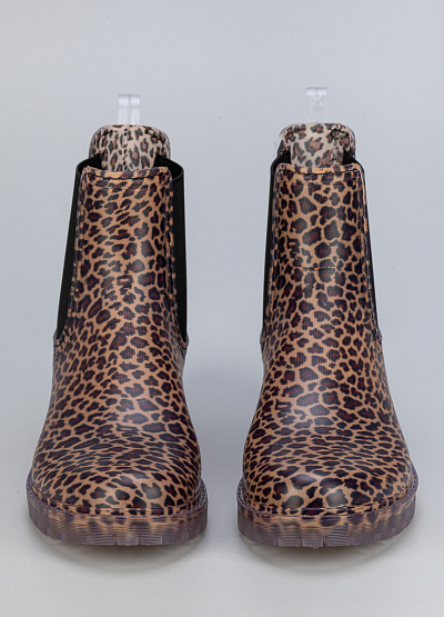 • Женские резиновые ботинки с леопардовым принтом – стильное и практичное решение для дождливой погоды. Яркий анималистичный узор добавляет выразительности, а эластичные боковые вставки обеспечивают удобство при надевании. Прозрачная подошва с рельефным протектором гарантирует устойчивость на мокрой поверхности.